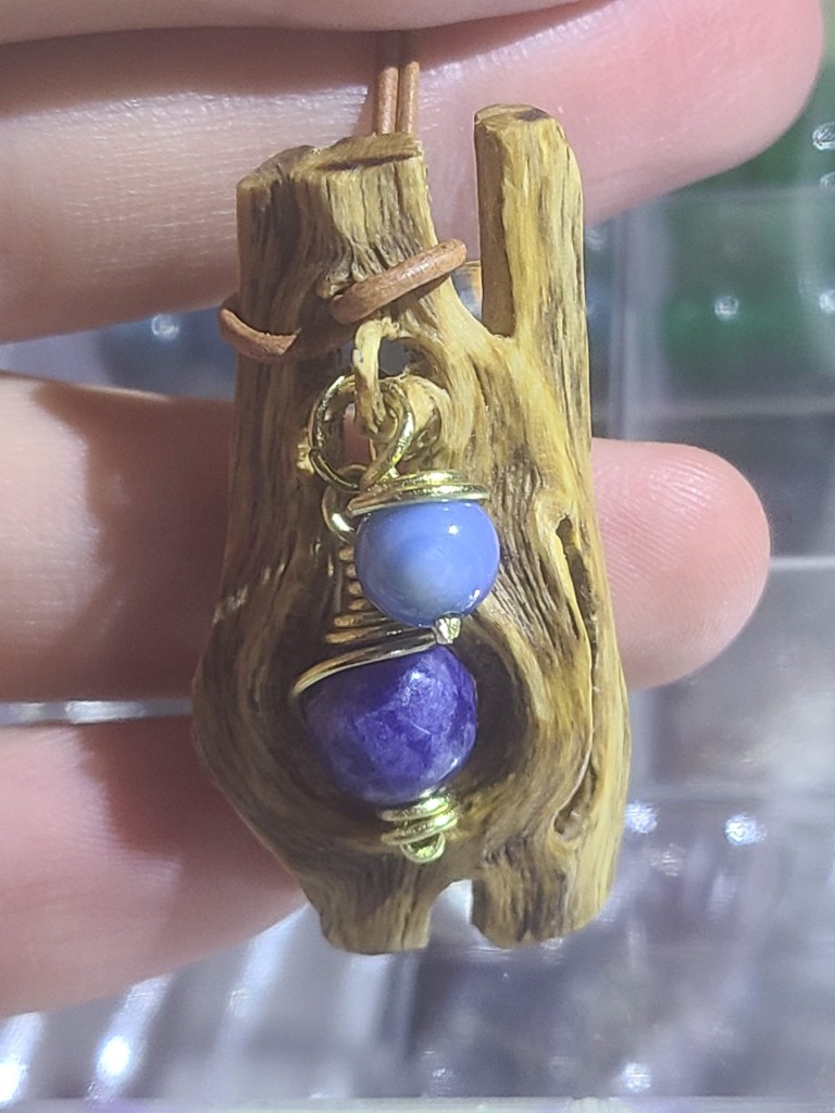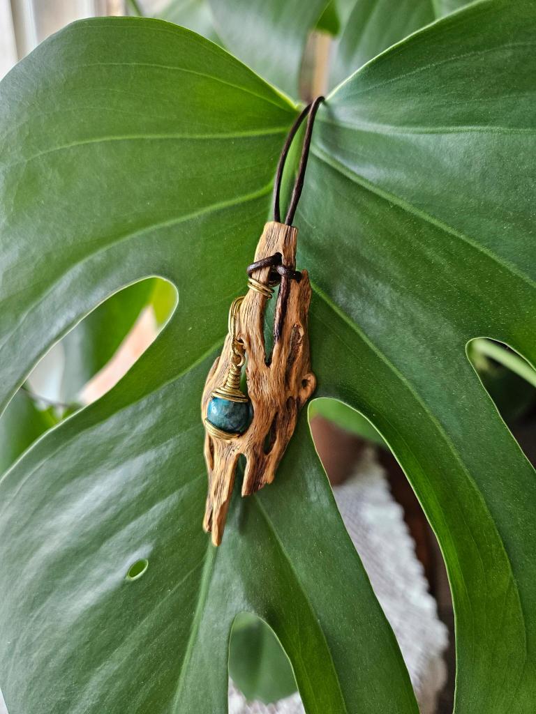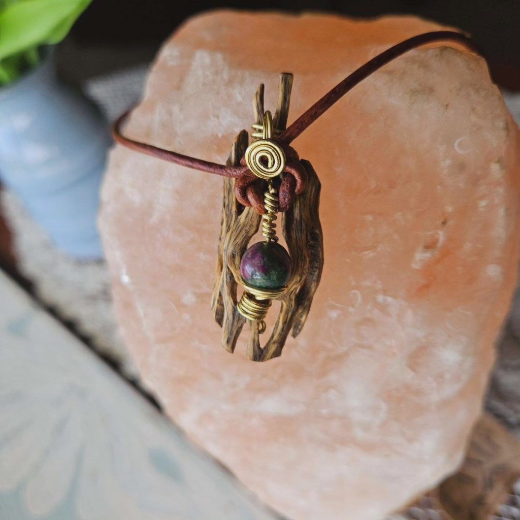 All cholla sourced by me from my land, handcut, sanded, and polished with a wire wrapped natural stone bead and attached to a leather cord sliding knot necklace.